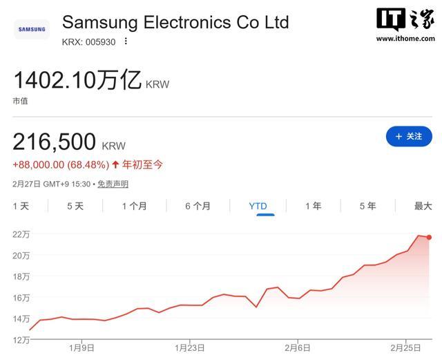 该公司的股价表现堪称一次奇迹反弹,其股价曾于 2024 年 11 月一度跌至近四年来的最低点,一度跌至 51700 韩元。IT之家发稿前,查询三星电子股价,目前已达到 216500 韩元,市值为 1402.10 万亿韩元。