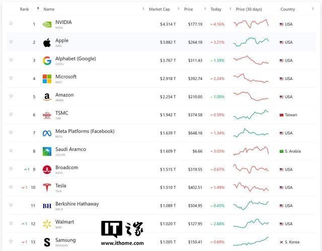 作为对比,其强劲对手韩国芯片制造商 SK 海力士排在第 21 位。此外,全球前十大市值公司中有八家来自美国,另外两家分别为沙特阿美和台积电。